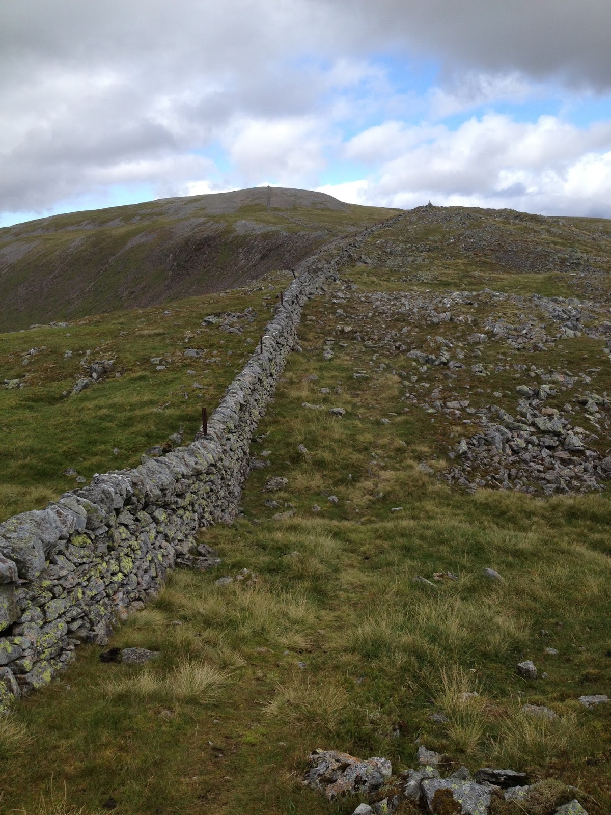 We managed to find shelter behind the dyke that ran all the way to the summit and beyond. Here we had a few more snacks and recovered from the strong winds! Dad phoned to say they were on their way down, and we could just see Mum's green jacket in the distance. By this point it was almost 6pm - time had marched on with us.